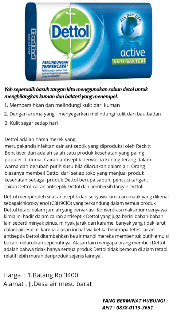 Buruan beli sabun detol, demi menjaga kesehatan keluarga kita dari kuman dan bakteri yang menempel. Afitsaputra Tidak Dikategorikan 28 April 2020 1 Minute Bagikan ini: Bagikan di X(Membuka di jendela yang baru) X Bagikan pada Facebook(Membuka di jendela yang baru) Facebook Suka Memuat... Terkait Diterbitkan oleh Afitsaputra Lihat semua pos milik Afitsaputra Telah Terbit 28 April 2020